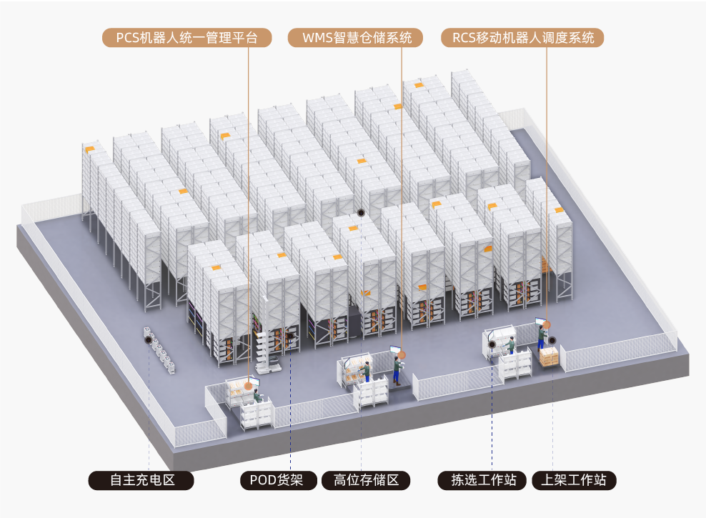 下揀:使用潛伏式AGV+POD料架的形式來實現揀選物料的快速出入庫和預分揀暫存,充分發揮潛伏式AGV快速靈活的搬運特點,實現從高位倉庫到揀選位/出入庫站點的接駁搬運。