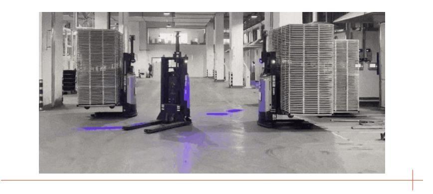 45臺(tái)潛伏車和叉車同場(chǎng)作業(yè),通過混合調(diào)度系統(tǒng)統(tǒng)一執(zhí)行調(diào)度,有效節(jié)約成本,減少不必要的分管制導(dǎo)致的交通管制等,同時(shí)打通設(shè)備邊界,自動(dòng)對(duì)接輸送線、烘房、提升機(jī)、貨梯等,實(shí)現(xiàn)各類物料全流程自動(dòng)化搬運(yùn),多種設(shè)備協(xié)同作業(yè),滿足工廠高生產(chǎn)節(jié)拍。